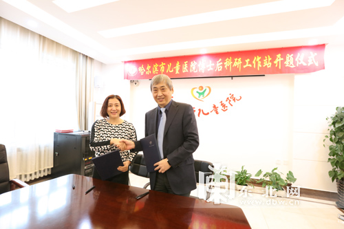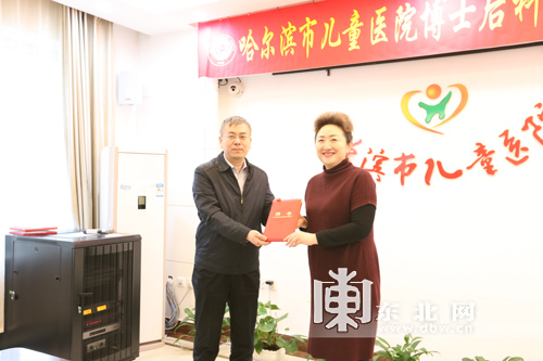 黑龍江省人社廳博士後管理辦公室劉磊主任在講話中表示,將進一步完善管理辦法,提高博士後培養質量,推動博士後創新創業並做好服務保障工作。省委、省政府非常重視博士後的培養工作,哈爾濱市也出臺了『英纔聚集計劃』等政策,這些都是保障博士後培養事業健康發展的有力保障。哈工大是省內非常知名的學府,單毓娟教授也是省內優秀博士後的傑出代表,希望哈工大與哈市兒童醫院精誠合作、攜手共贏,書寫人纔培養的新篇章。希望高鵬博士在站期間腳踏實地、刻苦鑽研,在導師的幫助下取得豐碩的成果,回報導師和醫院的培養。